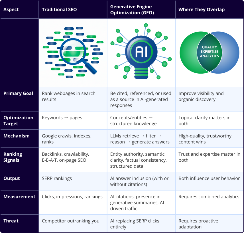 Before you can properly understand the mechanics of GEO, it’s essential to see how it differs from traditional SEO.